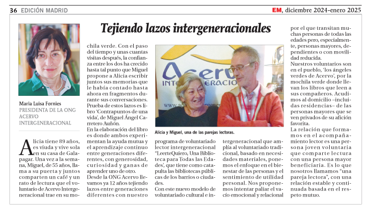 Desde la ONG Acervo llevamos ya doce años tejiendo lazos entre generaciones diferentes con nuestro programa de voluntariado lector intergeneracional “LeerteQuiero de Una Biblioteca para Todas las Edades” que tiene como catapulta las bibliotecas públicas de los barrios o ciudades.