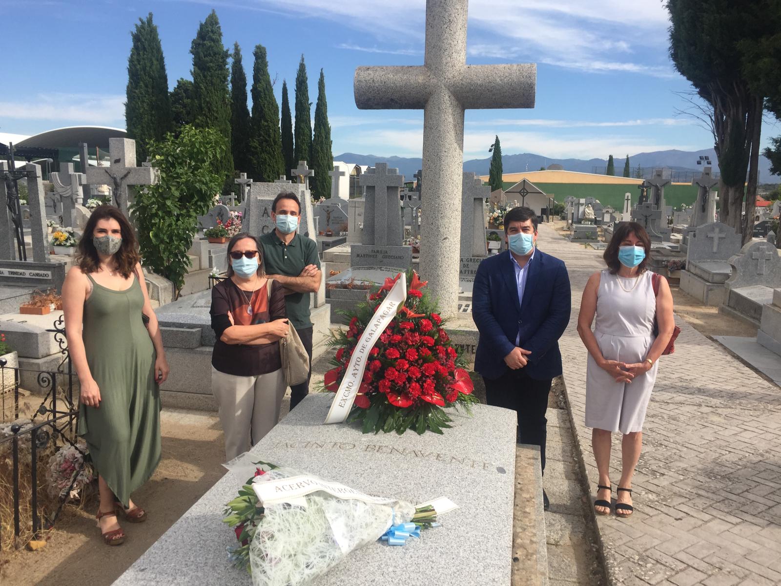 El 14 de julio nos reunimos ante la tumba del Premio Nobel, en el cementerio de El Chopo de Galapagar, un reducido grupo de personas, entre ellas, el alcalde de Galapagar, Alberto Gómez, la concejal de cultura, Rosa María Encuentra, el director de la Biblioteca Ricardo León, Pablo Parra, junto a Marina Cuervo, y la fundadora de Acervo Intergeneracional, María Luisa Forniés.